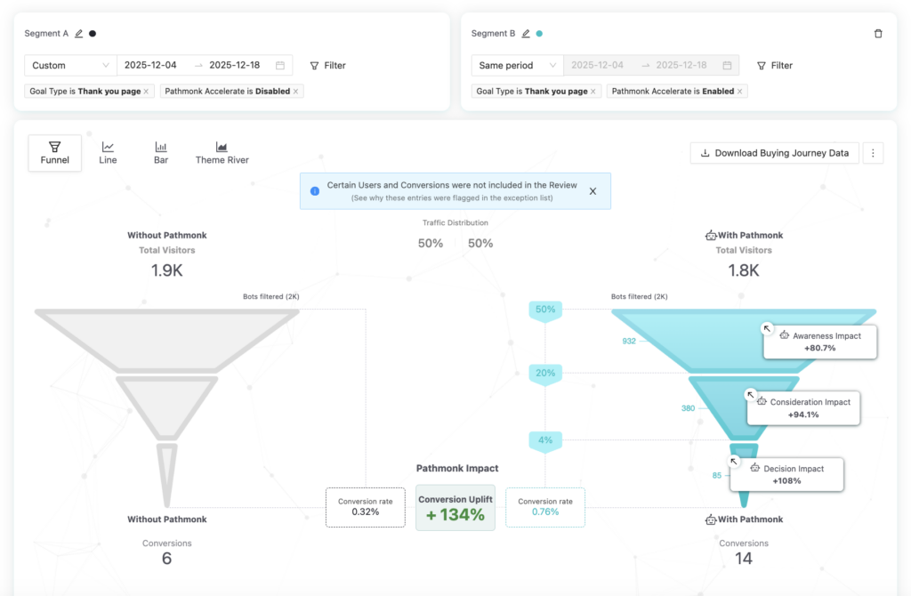 Across the 14-day evaluation period, Pathmonk consistently outperformed the control group at every stage of the funnel—awareness, consideration, and decision—making the uplift fully attributable to the AI-powered experiences rather than changes in traffic, seasonality, or website updates.