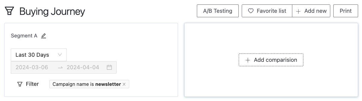 While viewing the Buying Journey report, click on “Add Comparison.” Choose the date range you’re interested in comparing, and then enter the name of the campaign you wish to analyze into “Segment B.”