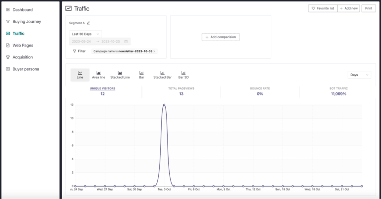 For a more detailed understanding of your campaign’s impact on your overall traffic, head to the Traffic report on your left-hand menu. This report provides a comprehensive overview of how your campaigns influence the volume and quality of traffic to your website.